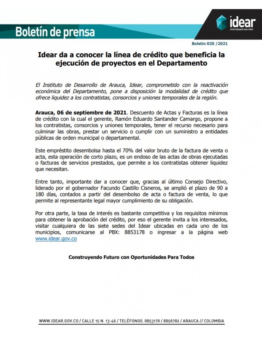 El Instituto de Desarrollo de Arauca, Idear, comprometido con la reactivación económica del Departamento, pone a disposición la modalidad de crédito que ofrece liquidez a los contratistas, consorcios y uniones temporales de la región.